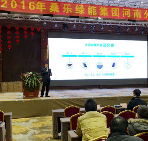 河南公司副總經(jīng)理陳宇對(duì)公司2016年新品與會(huì)展示。桑樂堅(jiān)持技術(shù)創(chuàng)新,從用戶體驗(yàn)入手的設(shè)計(jì)思路將桑樂綠能新品進(jìn)行了新的詮釋,并結(jié)合市場(chǎng)機(jī)遇提出了市場(chǎng)發(fā)展的新思路。