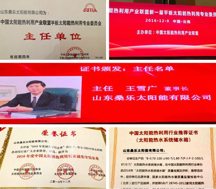 2016年是國家“十三五”規(guī)劃的開局之年,也是太陽能熱利用行業(yè)開啟發(fā)展新征程的起點(diǎn)。新的一年即將到來,作為平板專業(yè)委員會的會長單位,桑樂會責(zé)無旁貸,勇挑重?fù)?dān),在產(chǎn)業(yè)聯(lián)盟的領(lǐng)導(dǎo)下,與廣大光熱企業(yè)一起并肩作戰(zhàn),加大對相關(guān)政府部門的影響力度,積極進(jìn)行研發(fā)和創(chuàng)新,努力促進(jìn)行業(yè)內(nèi)、企業(yè)間的技術(shù)與市場推廣交流,共同把平板市場做大做強(qiáng),力爭用最短的時(shí)間內(nèi)迅速提高平板產(chǎn)品的市場份額,實(shí)現(xiàn)全體平板產(chǎn)品制造銷售企業(yè)的共贏,開創(chuàng)桑樂綠能新時(shí)代。