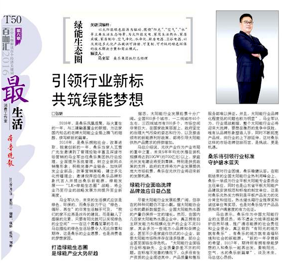 2016年,是桑樂擁抱社會、改革進取、銳意創(chuàng)新的一年,桑樂當家人王雪廣先生邀請到了管理經(jīng)驗豐富且深諳市場營銷的馬全軍出任桑樂集團執(zhí)行總經(jīng)理,全面提升系統(tǒng)管理,樹立全新網(wǎng)點銷售形象;積極完善產(chǎn)業(yè)鏈條,加快研發(fā)企業(yè)新品;改革營銷策略,建立多元化傳播理念;邀請倪萍擔任桑樂品牌形象代言人并提出桑樂新能源,綠能發(fā)展——“LE+綠能生態(tài)圈”戰(zhàn)略,將企業(yè)乃至行業(yè)的戰(zhàn)略發(fā)展方向提升至全新高度。