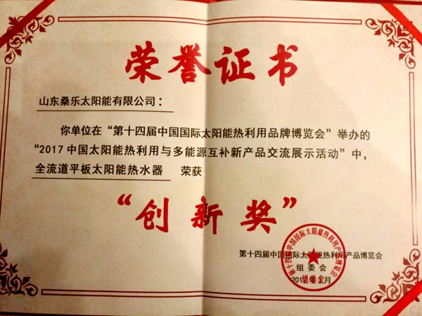 2017中國太陽能熱利用與多能源互補新產(chǎn)品交流展示活動頒獎盛典盛大舉行,桑樂集團在第十四屆中國國際太陽能熱利用產(chǎn)品博覽會上獲得“創(chuàng)新獎”。隨著社會發(fā)展和人民生活改善,特別是進入新常態(tài)以來,創(chuàng)新被國家確立為五大發(fā)展理念之首,國家和社會對太陽能熱利用行業(yè)提出了“鞏固擴大太陽能熱水市場,推動供暖和工農(nóng)業(yè)熱水等領(lǐng)域的規(guī)?;瘧?yīng)用,拓展制冷、季節(jié)性儲熱等新興市場,形成多元化的市場格局”的更高要求,太陽能熱利用行業(yè)唯有持續(xù)的創(chuàng)新,才能實現(xiàn)從量到質(zhì)的飛躍,不斷滿足社會發(fā)展對新能源的要求。中國太陽能熱利用產(chǎn)業(yè)聯(lián)盟執(zhí)行理事長張曉黎表示,本次太博會上組委會舉辦創(chuàng)新獎評選,目的是鼓勵和支持創(chuàng)新,鼓勵太陽能熱利用應(yīng)用在熱水、采暖、工農(nóng)業(yè)新領(lǐng)域。