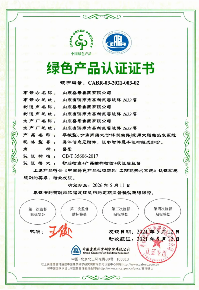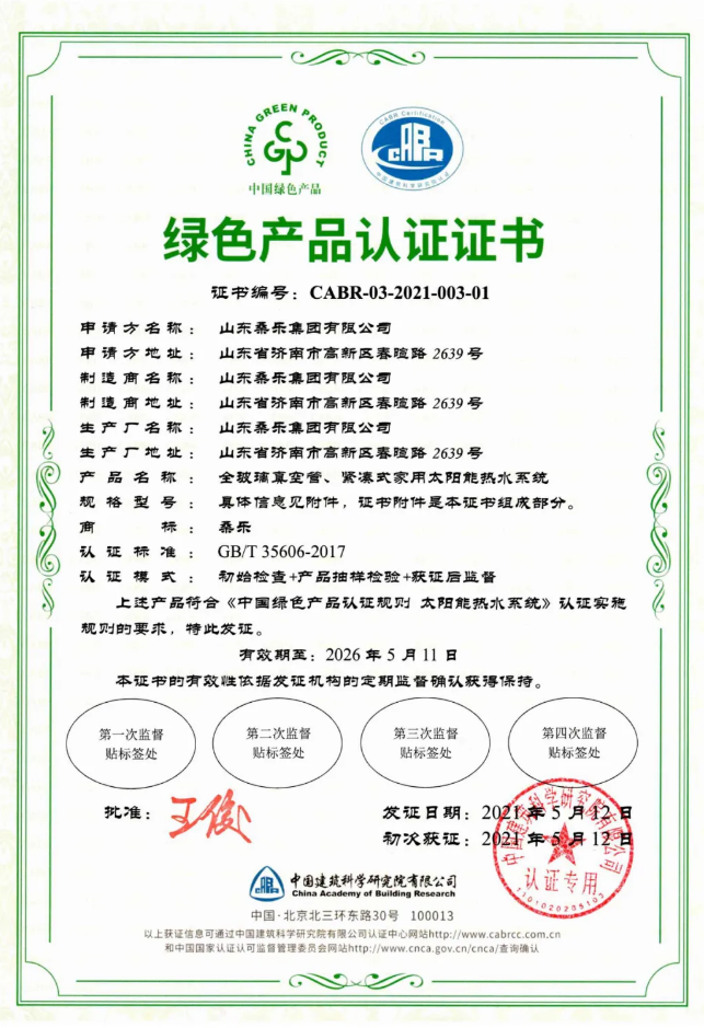 日,通過中國建筑科學研究院有限公司認證,桑樂集團榮獲太陽能熱水系統(tǒng)中國綠色產(chǎn)品認證證書,這也是中國建研院頒發(fā)的首個太陽能領域綠色產(chǎn)品認證證書。